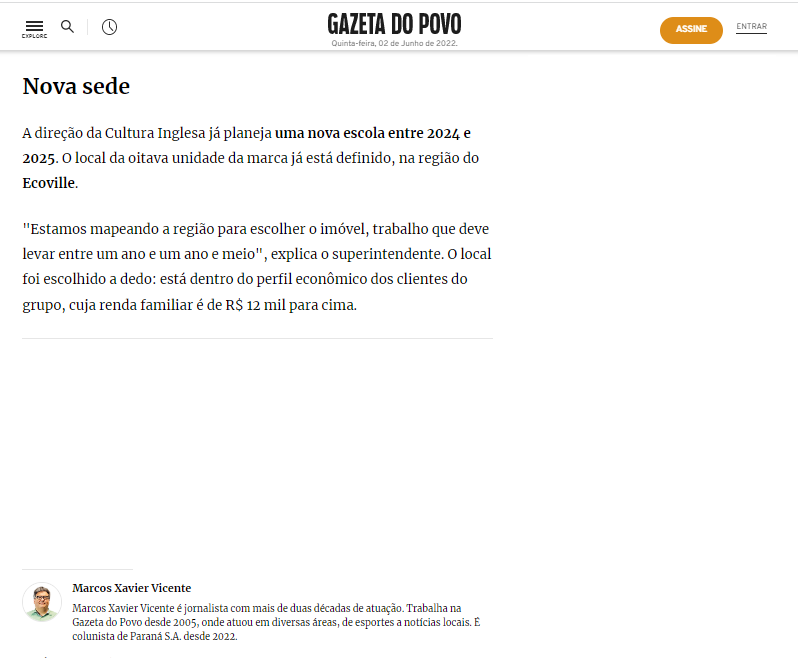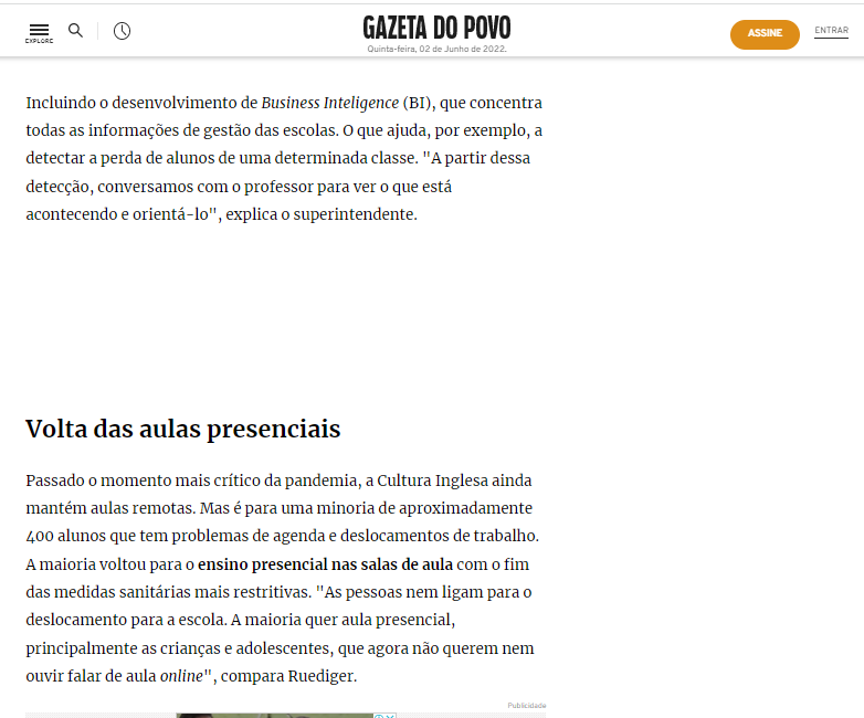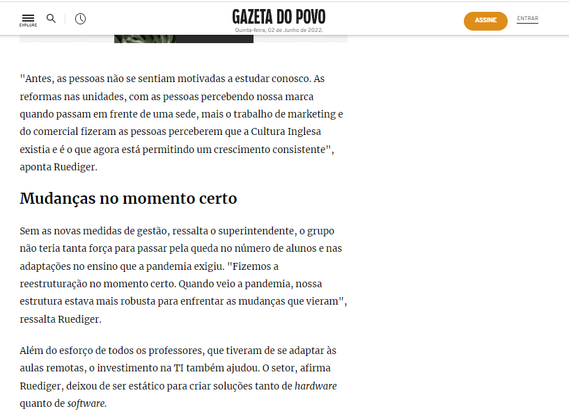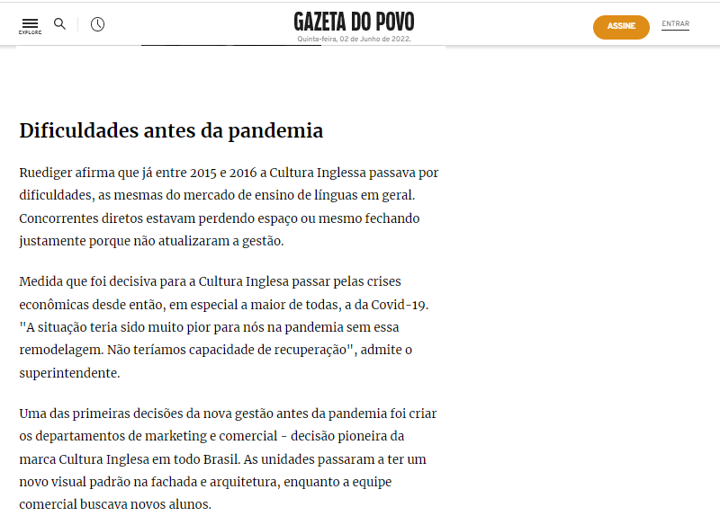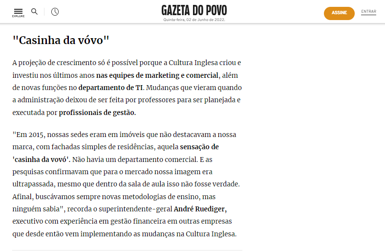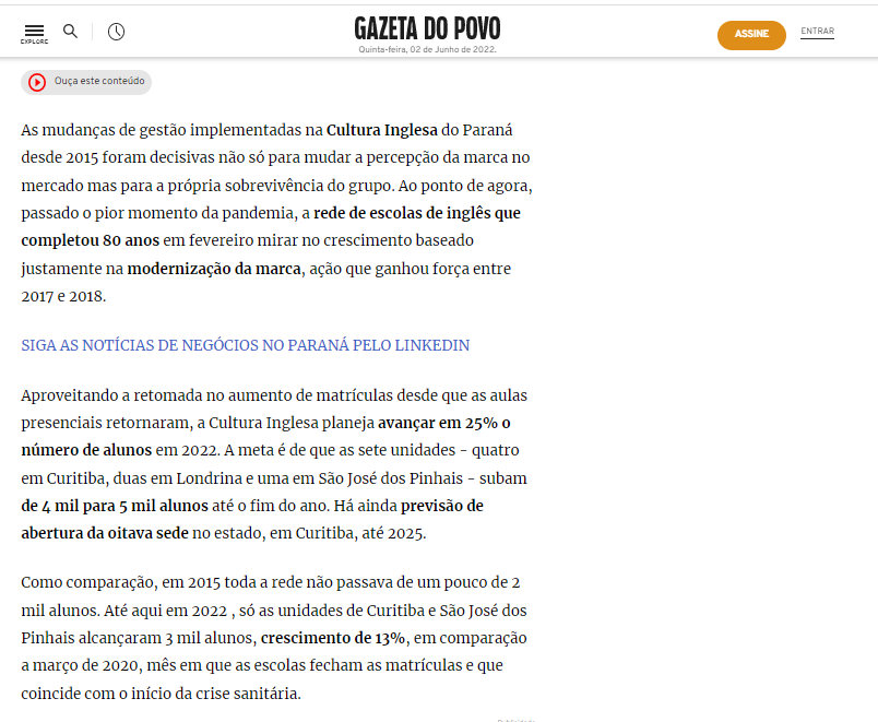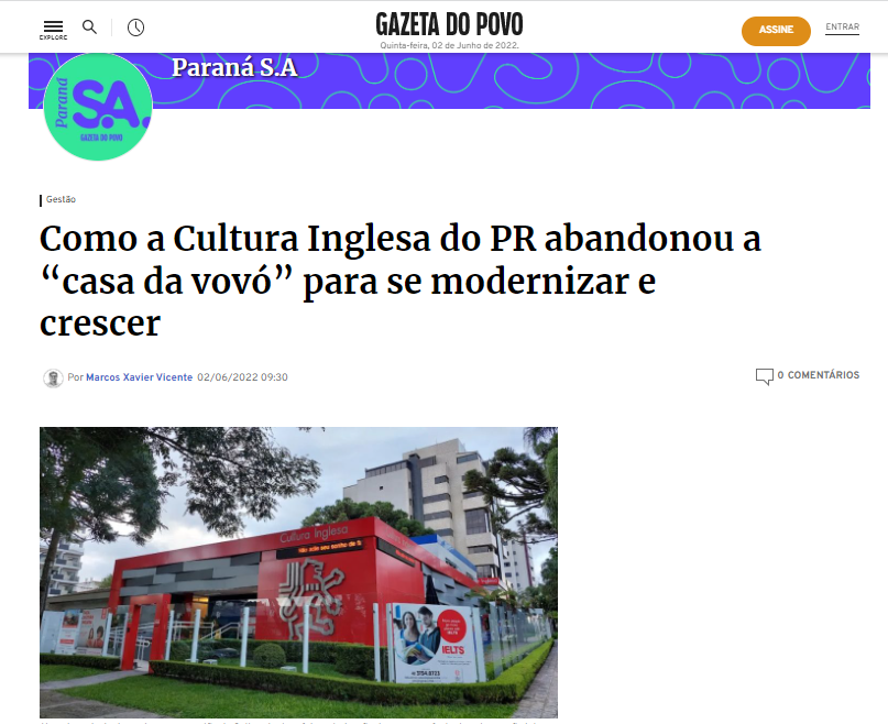 O jornal Gazeta do Povo publicou nesta quinta-feira (02/06/22) uma matéria destacando o sucesso da Cultura Inglesa de Curitiba na gestão da crise gerada pela pandemia, que afetou muito o setor de educação nos últimos anos. Publicada na editoria Paraná S.A, que trata de economia, empresas e negócios do Paraná, a matéria, intitulada “Como a Cultura Inglesa do PR abandonou a “casa da vovó” para se modernizar e crescer”, destaca as mudanças na gestão da escola, o investimento nas áreas de marketing e comercial, o crescimento do número de alunos e os planos de expansão. Confira!